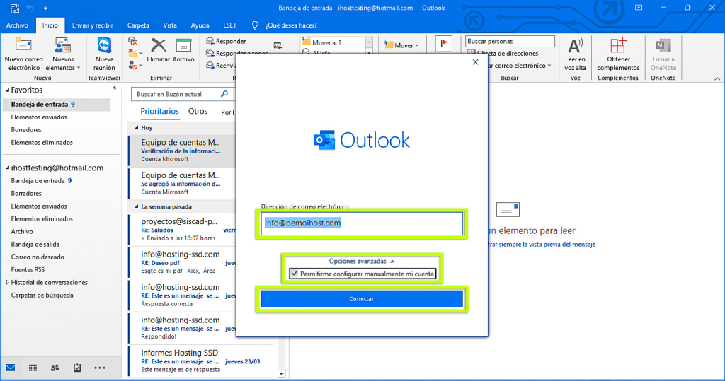 5. Ingrese el correo que desea configurar, desplegar Opciones avanzadas y seleccionar Permitirme configurar manualmente mi cuenta. Presione el botón Conectar.
