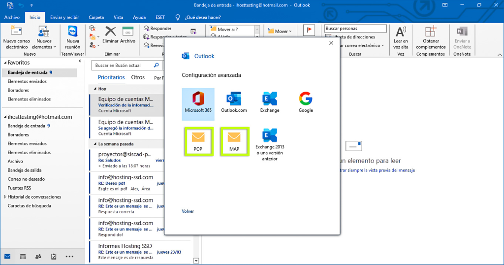 6. Outlook le permite elegir el tipo de cuenta con respecto al enlace a su correo, los más comunes son POP e IMAP.