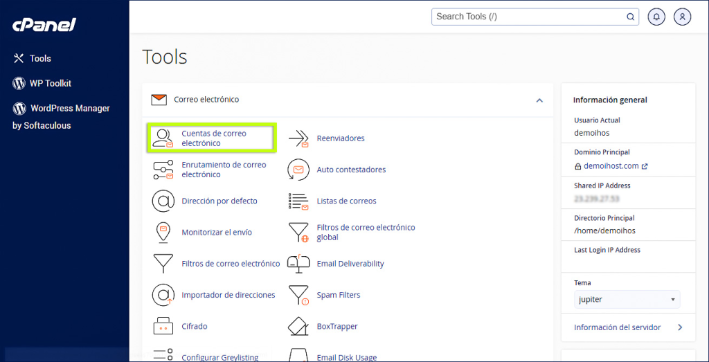 1. Obtener los parámetros que corresponden a nuestro correo, para ello debemos ingresar en Cpanel – www.midominio.com/cpanel – Ubicar e ingresar a Cuentas de correo electrónico en la sección de Correo electrónico.