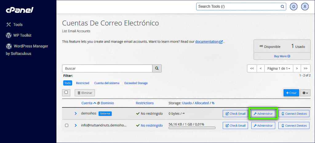 3. Presione el botón Administrar de la cuenta del correo que quiere modificar.