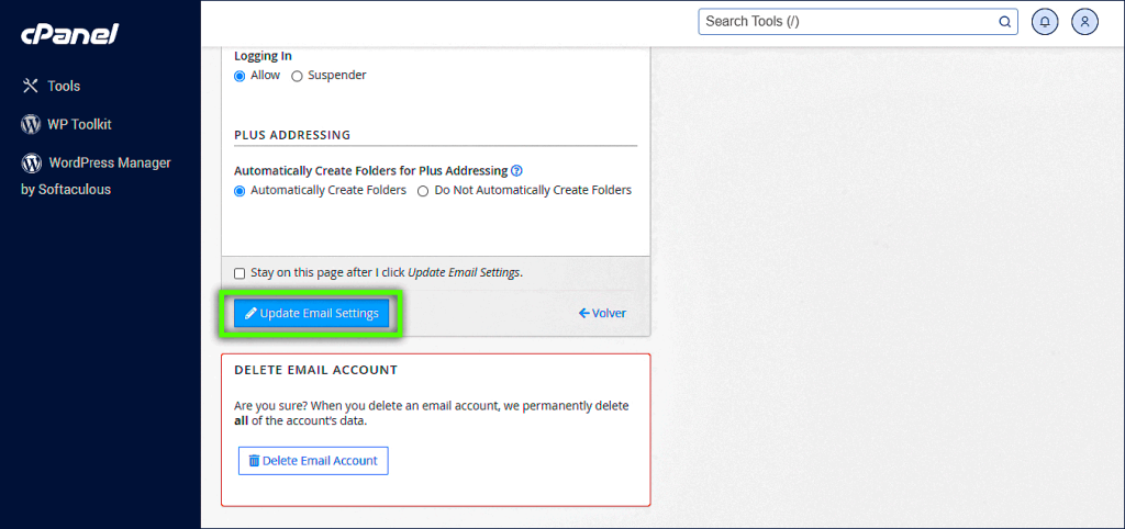 5. Haga clic en Update Email Settings para guardar los cambios.